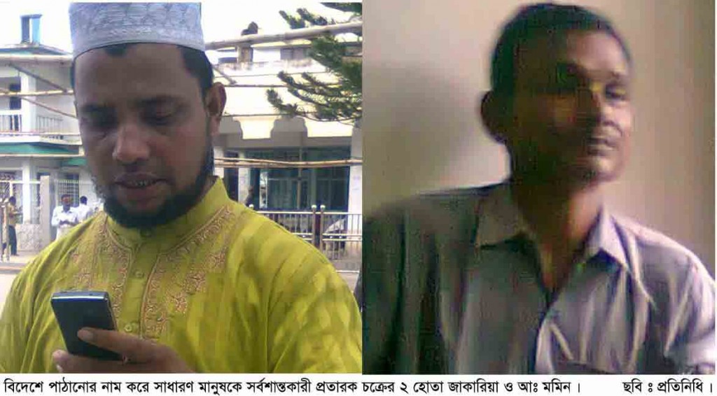 প্রবাসীদের মাধ্যমে দেশের অর্থনৈতিক অবস্থা লাভবান হলেও দেশীয় আদম বেপারীদের কারনে বর্তমান সময়ে বহু পরিবার নিঃস্ব হওয়ার ঘটনা ঘটছে। তেমনি একটি ঘটনা চাঁদপুরের শাহরাস্ত্মি উপজেলার সূচীপাড়া উত্তর ইউনিয়নের সূচীপাড়া গ্রামে ঘটেছে। জানা যায়, ওই গ্রামের রব মুন্সী বাড়ীর মৃত আঃ রশিদের পুত্র হেলার উদ্দিন (৫০) প্রবাসে যাওয়ার আশায় প্রতারক দুই আদম বেপারীর খপ্পরে পড়ে সর্বশান্ত্ম হয়েছে। এ বিষয়ে নিঃস্ব হেলাল উদ্দিনের সাথে আলাপে জানা যায়, তিনি সূচীপাড়া বাজারে ছোট্ট দোকান ব্যবসা করতেন। একদিন একই উপজেলার চিতোষী পশ্চিম ইউনিয়নের আয়নাতলী ভূঁইয়া বাড়ির মৃত আঃ কাদেরের পুত্র আঃ মমিন হেলালকে ব্রুনাই পাঠানোর প্রস্ত্মাব করে। এতে হেলাল রাজী হলে পার্শ্ববর্তী হাজীগঞ্জ উপজেলার টোরাগড় গ্রামের ইনাগাজী হাজ্বি বাড়ীর মাওঃ মোঃ আইয়ুব আলীর পুত্র প্রতারক চক্রের আঞ্চলিক হোতা আদম বেপারী জাকারিয়া খাঁন ওরফে জাকিরের (৩৬) সাথে ৩ লক্ষ ৭০ হাজার টাকা ভিসা প্রদান চুড়ান্ত্ম করে। এ সুবাদে হেলাল মমিনের নির্দেশনায় ব্রুনাই যাওয়ার সকল ব্যবস্থা সম্পন্ন করেন এবং খুব দ্রম্নতই হেলালের পাসপোর্টের উপর ভিসা লাগে, আর বিমানের টিকিট ক্রয়ও সম্পন্ন হয়। এতদ্বসত্বেও ওই ভিসা দালাল মমিন ও জাকারিয়া গোপন যোগসাজসে অন্যত্র বিক্রি করে হেলালকে প্রবাস জীবন থেকে বঞ্চিত করে। এলাকাবাসী সূত্রে জানা যায়, হেলাল বিদেশ যাবে বলে একমাত্র পরিবার চালানোর অবলম্বন দোকান খানা বিক্রি করে ও বিভিন্ন জন আর সংস্থার কাছ থেকে ঋণ করে ওই টাকা মমিনের হাতে তুলে দেয়। আজ হেলাল পথের ফকির। থানার অভিযোগ সূত্রে জানা যায়, আদম বেপারীর খপ্পরে পড়া হেলাল বাদী হয়ে মমিন ও জাকারিয়াকে বিবাদী করে যে অভিযোগ দায়ের করেন তাতে হেলালের বর্তমান দৈন্যদশা ও শিশু পুত্রকে হারানোর কারন লিপিবদ্ধ রয়েছে। এ বিষয়ে সংশিস্নষ্ট আইন প্রশাসনের কাছে সুষ্ঠু ও সঠিক বিচার দাবী করেন প্রতারিত হওয়া হেলাল উদ্দিন।