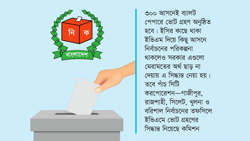 আগামী দ্বাদশ জাতীয় সংসদ নির্বাচন ইলেকট্রনিক ভোটিং মেশিনে (ইভিএম) হচ্ছে না। ৩০০ আসনেই ব্যালট পেপারে ভোট গ্রহণ অনুষ্ঠিত হবে। ইসির কাছে থাকা ইভিএম দিয়ে কিছু আসনে নির্বাচনের পরিকল্পনা থাকলেও সরকার এগুলো মেরামতের অর্থ ছাড় না দেয়ায় এ সিদ্ধান্ত নেয়া হয়। তবে পাঁচ সিটি করপোরেশন—গাজীপুর, রাজশাহী, সিলেট, খুলনা ও বরিশাল নির্বাচনের তফসিলে ইভিএমে ভোট গ্রহণের সিদ্ধান্ত নিয়েছে কমিশন। গতকাল রাজধানীর আগারগাঁওয়ে নির্বাচন কমিশন ভবনে ইসির ১৭তম সভায় এসব সিদ্ধান্ত নেয়া হয়েছে। এদিন পাঁচ সিটি করপোরেশন, একটি উপজেলা ও পাঁচটি পৌরসভা নির্বাচনের তফসিল ঘোষণা করা হয়।